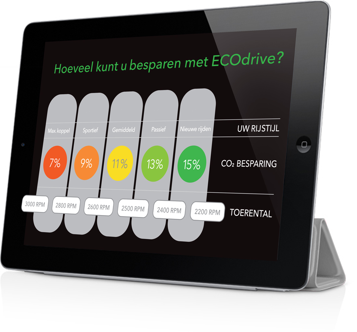 ECOdrive is een intelligente rijgedragstimulator die op uw specifieke omstandigheden kan worden afgestemd. Uniek aan deze techniek is dat de maximumsnelheid, de acceleratie en het toerental per versnelling kunnen worden aangepast. Het resultaat? Uw chauffeurs rijden rustiger en dus veiliger. Met ECOdrive wordt er optimaal gebruikgemaakt van het motorvermogen van het voertuig. De ECOdrive geeft sturing aan uw vermogen en draagt zorg dat er alleen meer vermogen wordt geleverd op de momenten dat het nodig is.